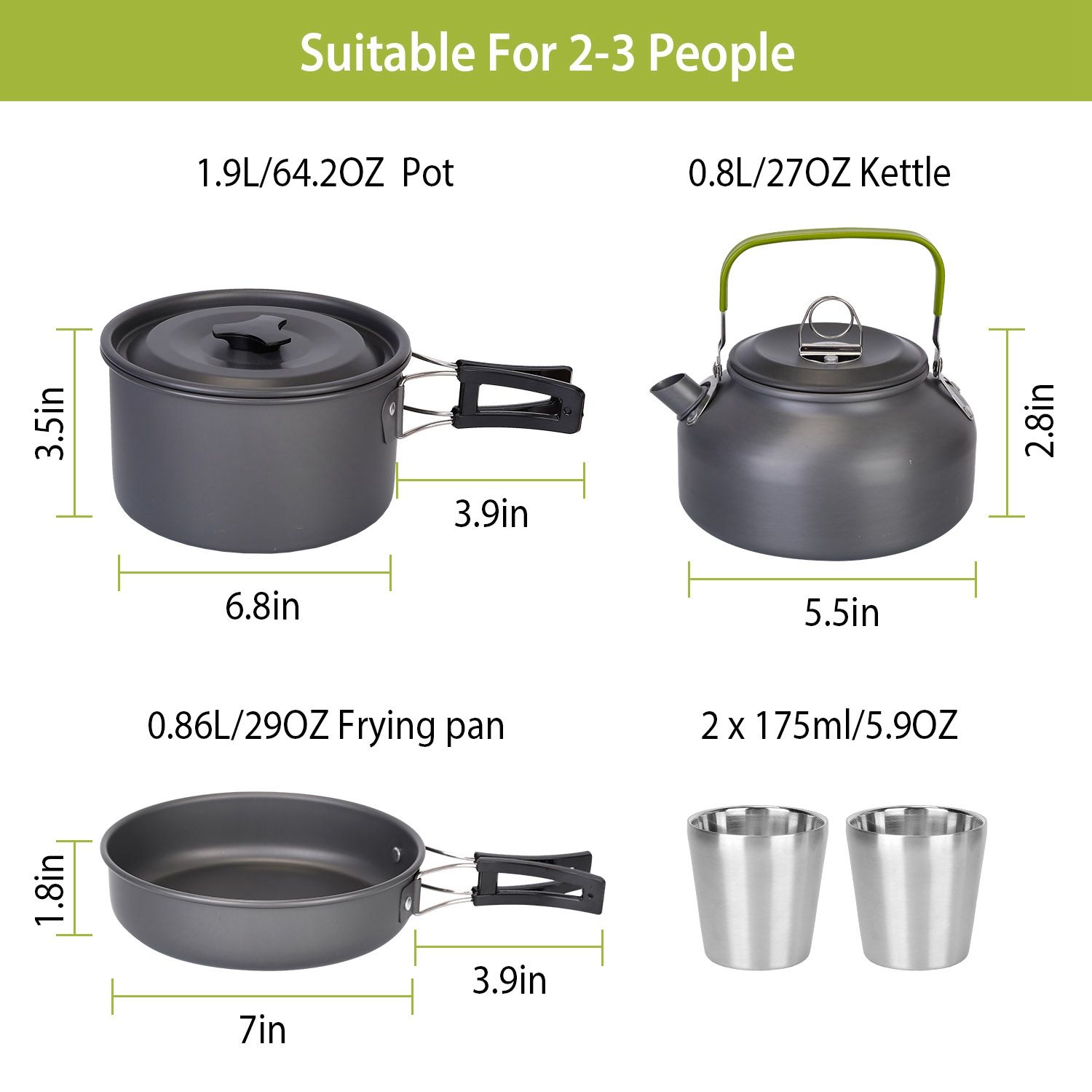12Pcs Outdoor Cooking Set: This package contains one pot(1.9L), one kettle with lid(0.8L), one frying pan(0.86L), one pot lid, one carabiner, one spoon, one fork, one knife, two cups(175ml), and two storage bags. You can find everything you need for outdoor cooking in this package.