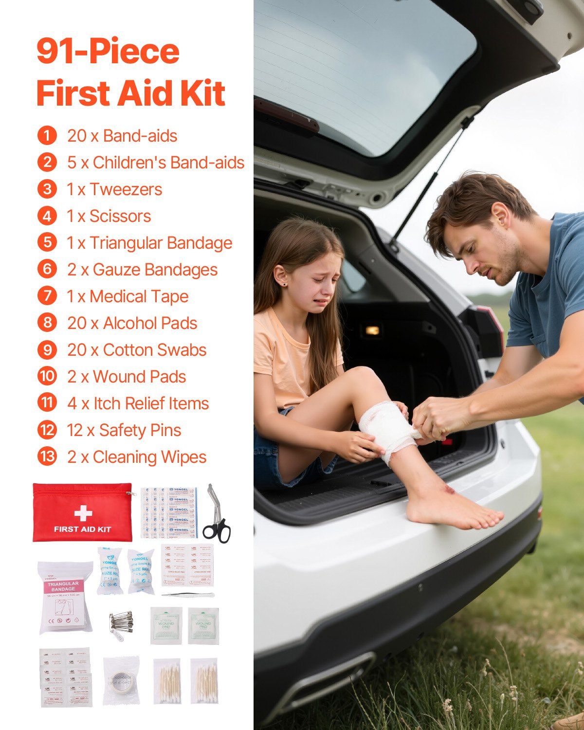 5.Compact First Aid Kit: This roadside emergency kit includes daily medical essentials for all ages: bandages, tweezers, scissors, triangular bandage, gauze rolls, medical tape, alcohol pads, cotton swabs, wound pads, anti-itch tablets, pins, and antiseptic wipes