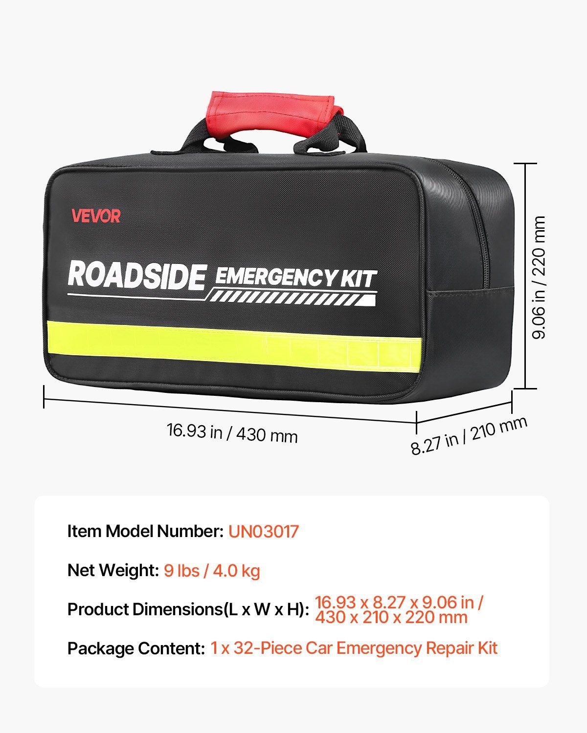 1.32-Piece Complete Kit: This roadside emergency car kit includes a portable air pump, jumper cables, reflective triangle, vest, toolbox, and a full first aid kit for all ages, handling all your emergency needs on the road