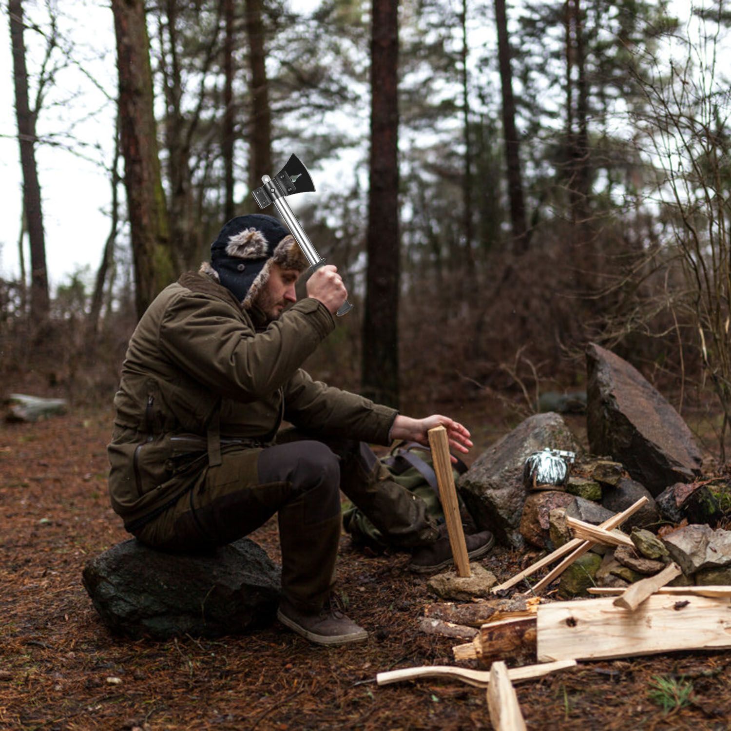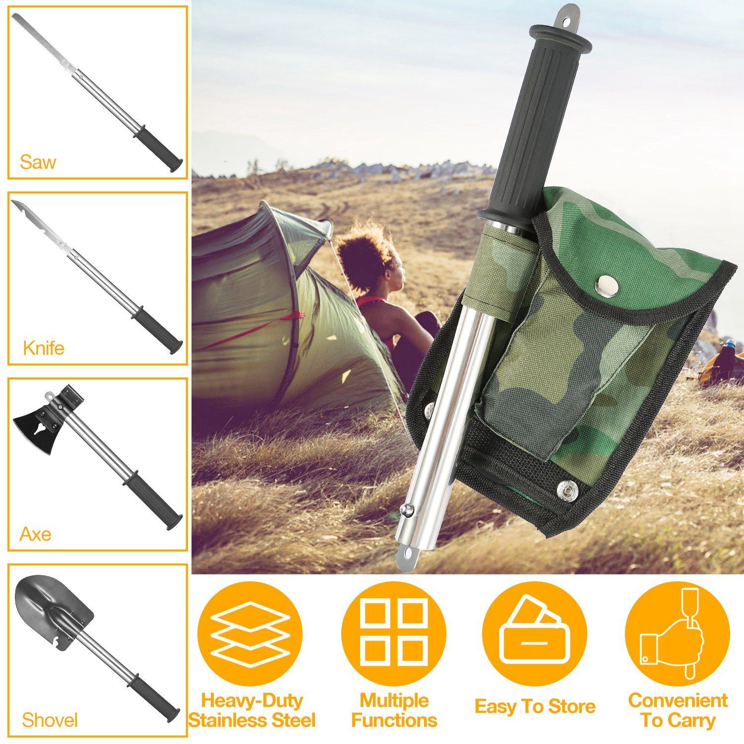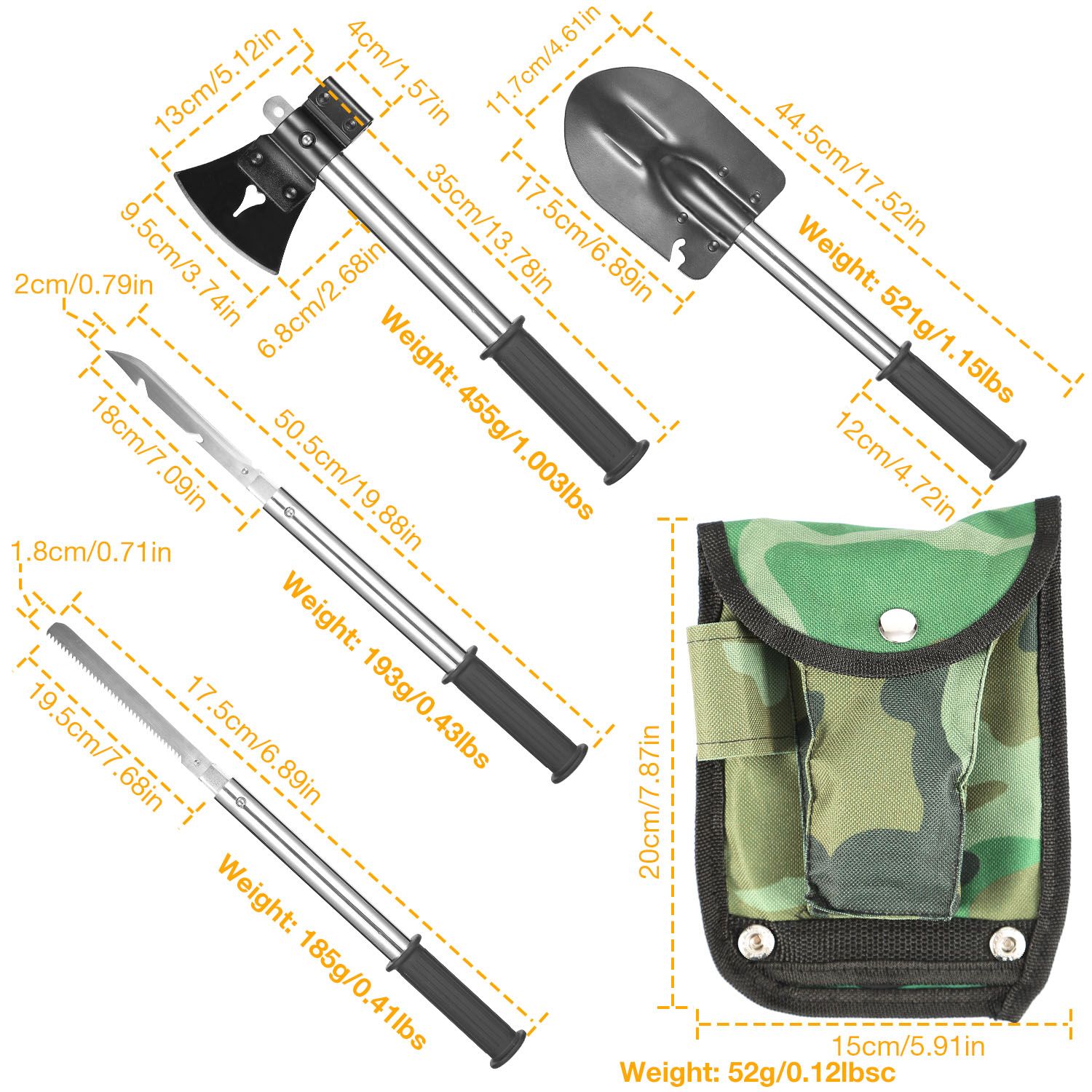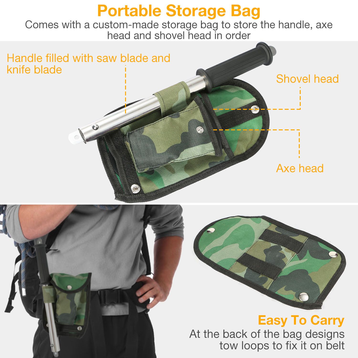 * EASY TO STORE: The saw blade and knife blade can be organized into the handle. And it comes with a custom-made storage bag to store the handle, axe head and shovel head in order. Besides, the storage bag can be fixed on your belt for an easy carry.