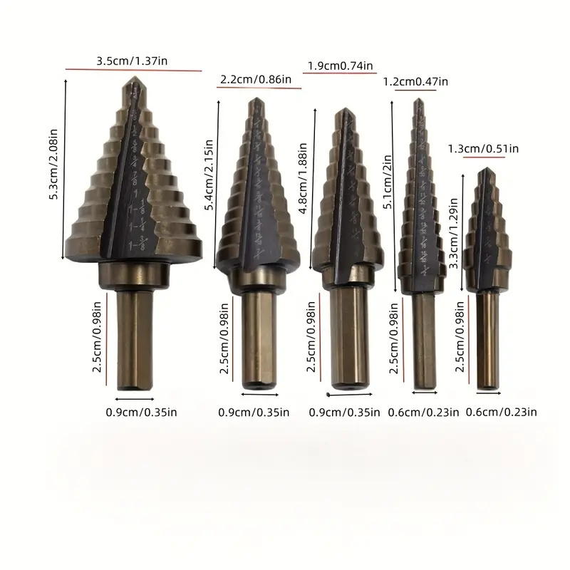 5-Piece High-Speed Steel Pagoda Step Drill Bit Set – Baked Yellow Finish, Triangular Shank DesignProfessional Multi-Size Hole Opener Kit for Metal, Wood & Plastic Key Features:Baked Yellow Surface Treatment – Enhanced hardness & corrosion resistance vs. standard HSS bits.Triangular Shank Design – Prevents bit slippage in drill chucks for safer operation.Pagoda/Step Drill Geometry – Cuts 3-32mm holes progressively with smooth edges (no burrs).High-Speed Steel (HSS) Material – Stays sharp 5x longer than carbon steel bits.5 Sizes in Set – Covers most DIY/industrial needs (includes common HVAC/plumbing sizes). Professional Applications:Metalworking – Sheet metal, aluminum, copper pipesWoodworking – Cabinet hinges, dowel holesPlastic/Fiberglass – Clean holes without crackingAuto/Electronics – Enlarging existing holes