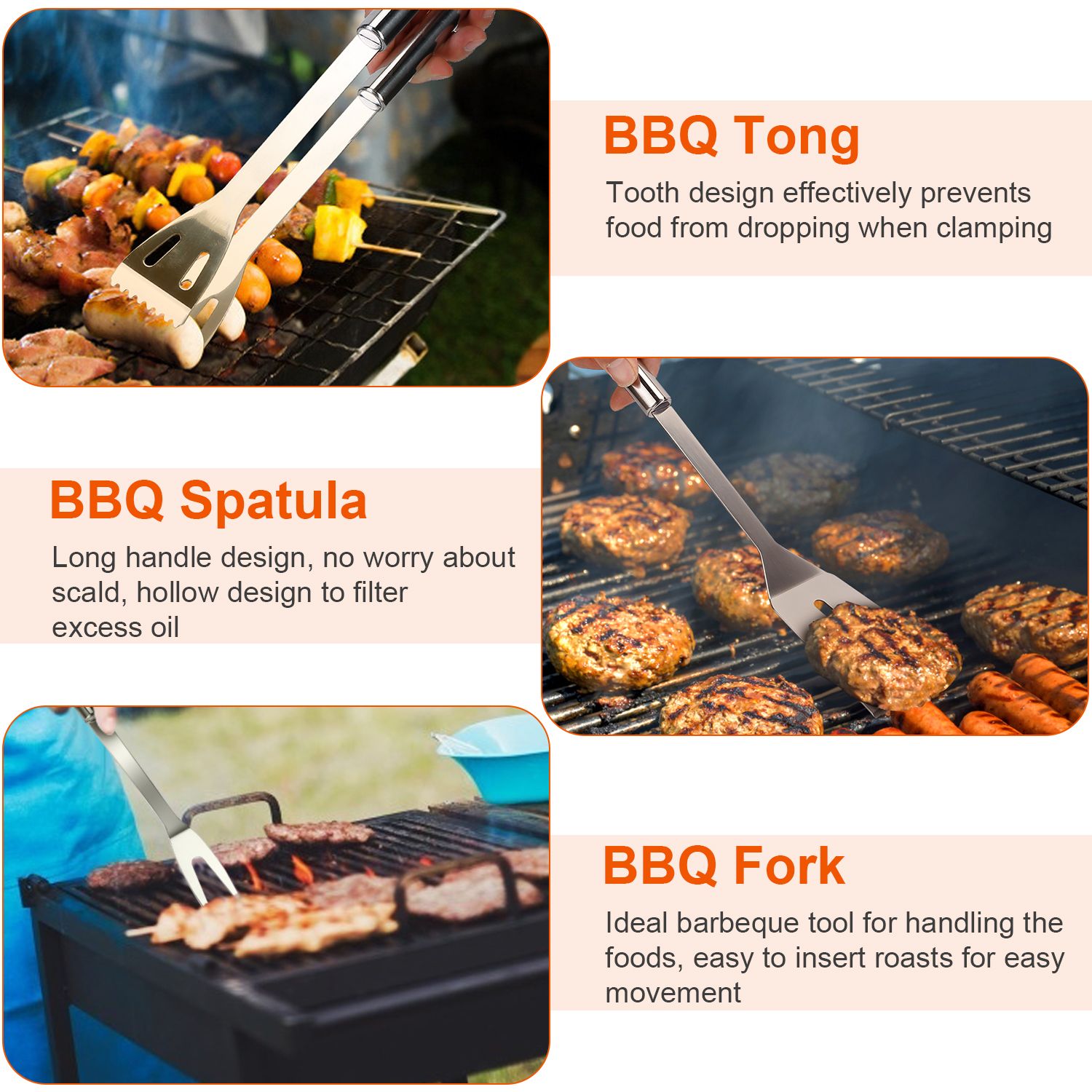**Premium Stainless Steel*:Each barbecue tool is made from high stainless steel which is rust resistant for long-lasting reliability. Stainless steel tools are also more durable than wood alternatives as they will not crack after extended use.